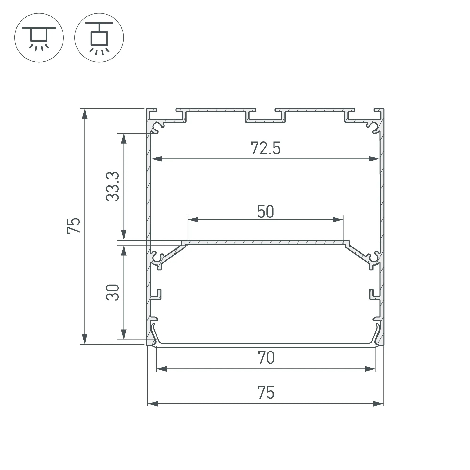 Алюминиевый профиль для светодиодных лент и линеек. Цвет - белый RAL9003 (порошковая окраска). Габаритные размеры (L×W×H): 2000x75x75 мм. Ширина площадки для ленты 50 мм. Отсек для БП 72,5х33,3 мм. Экраны, заглушки и другие аксессуары приобретаются отдельно. Цена за 1 метр.
