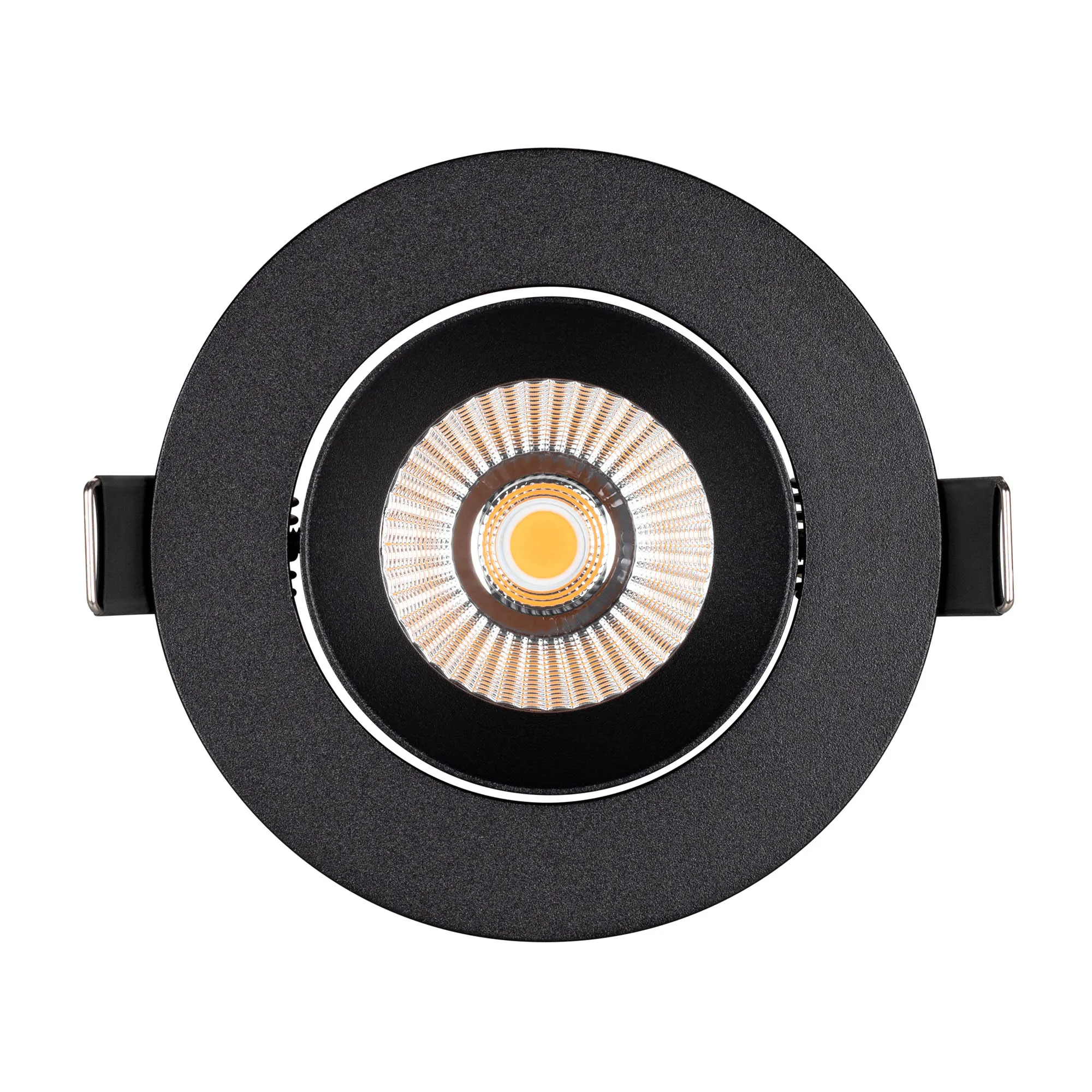 Встраиваемый поворотный светильник даунлайт. Мощность 10 Вт, св. поток 750лм, 75 лм/Вт, тёплый 3000 K, CRI>90, угол 36°, напряжение питания 230 В. Чёрный круглый корпус из алюминия, экран PMMA, степень защиты IP54. Размер: диаметр 94 мм, высота 75 мм. Монтаж встраиваемый, установочное отверстие: диаметр 77 мм. Драйвер IP54, 20-40 В, 250 мА, пульсация <1%.