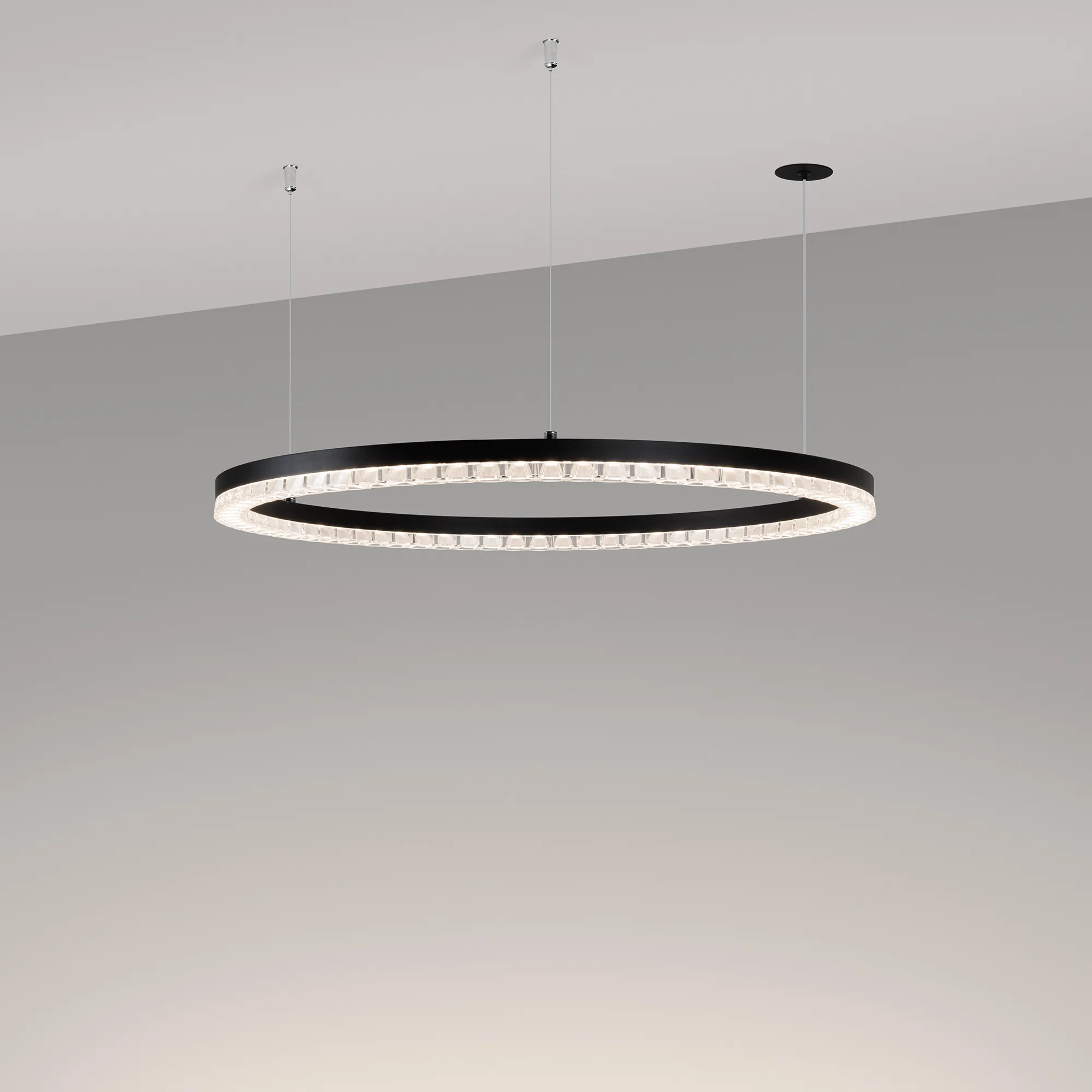 Подвесной светильник. Мощность 36 Вт, св. поток 3160 лм, 80-95 лм/Вт, дневной белый 4000K, CRI>90, угол 45°, напряжение питания 230 В. Чёрный круглый корпус из алюминия, экран PMMA, степень защиты IP20. Размер: диаметр 650 мм, высота 34 мм, ширина профиля 30 мм, размер чаши: диаметр 65 мм, высота 26 мм. Монтаж подвесной, длина подвеса 1200 мм, тип чаши встраиваемый, диаметр установочного отверстия чаши 60 мм. Драйвер 27-38 В, 1050 мА. Пульсация <0,3 %.