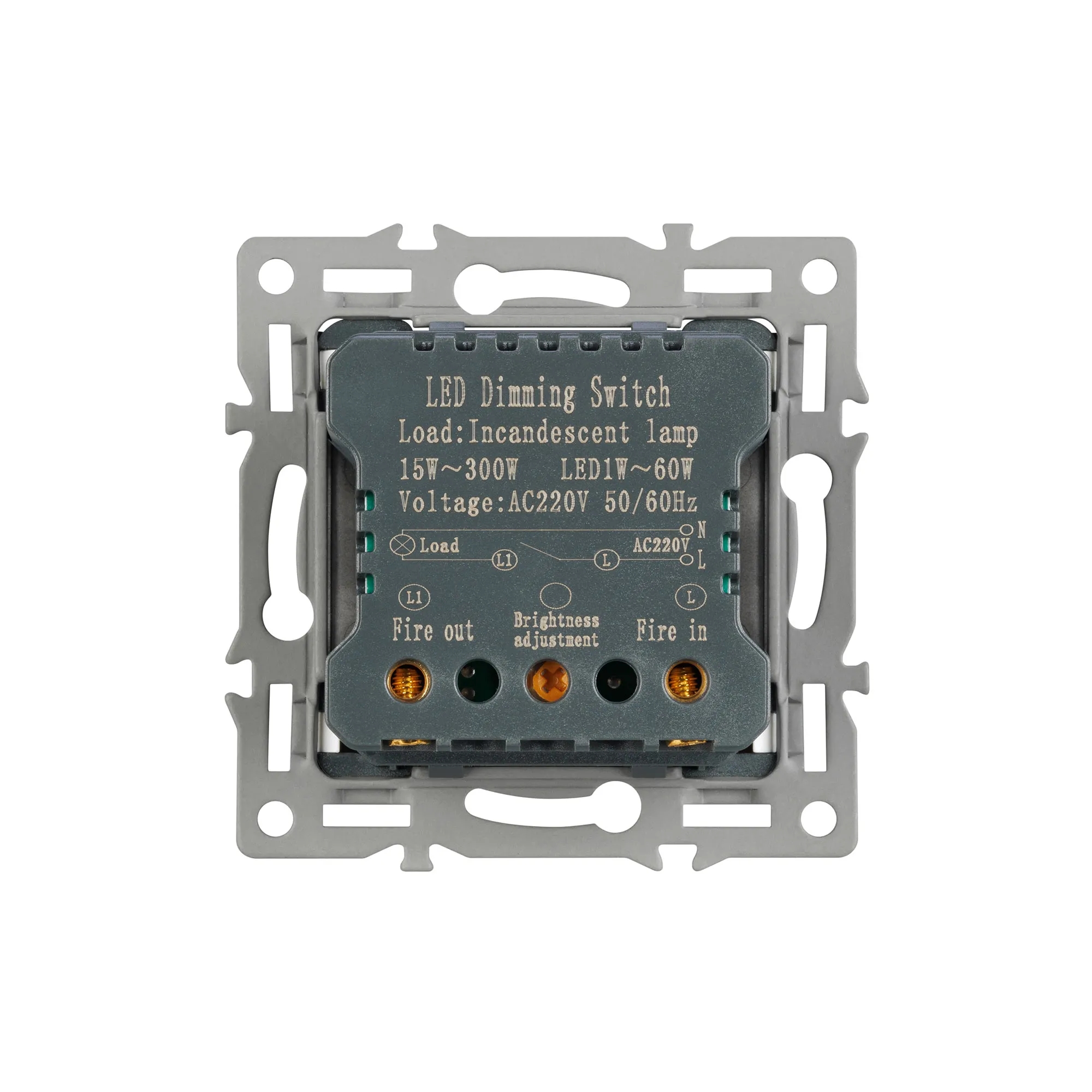 Механизм регулировки света на 1 пост, с суппортом из алюминия. Цвет - белый. Без фронтальной рамки. Уровень пылевлагозащиты - IP20. Механизм устанавливается в стандартный круглый подрозетник. Максимальная нагрузка 300 Вт только для ламп накаливания и галогенных, 100 Вт только для энергосберегающих и светодиодных ламп.